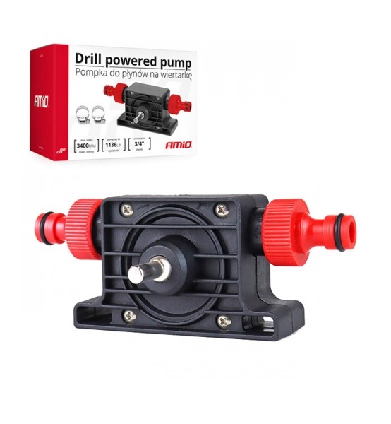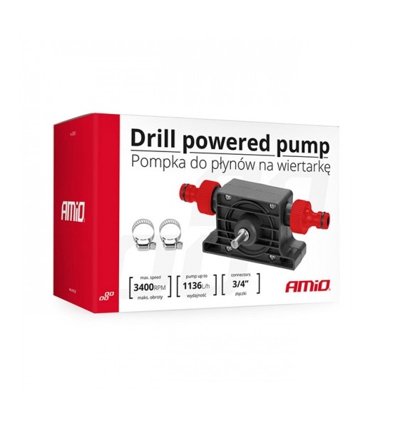 Αντλία αναρρόφησης υγρών (νερού/λαδιού) για λειτουργία με δράπανο (εργαλείο χειρός που περιστρέφεται), πολωνικής προέλευσης της εταιρίας Amio. Η αντλία διαθέτει δύο υποδοχές (δεξιά/αριστερά) για σύνδεση με λάστιχο (τύπου ποτίσματος) για να αντλεί το υγρό και να το αδειάζει σε δοχείο ή μπετόνι της αρεσκείας σας. Στο κέντρο της αντλίας υπάρχει υποδοχή για να συνδέσετε το δράπανο, ώστε να δίνει στην αντλία τη δύναμη να κάνει την άντληση υγρού. Στην συσκευασία περιλαμβάνονται 2 σφυχτήρες για σταθεροποίηση του λάστιχου πάνω στην αντλία. Κατάλληλο προιόν για άντληση υγρού από δυσπρόσιτα σημεία.