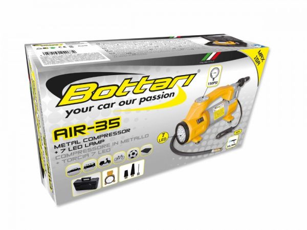 Μίνι μεταλλικός φουσκωτός συμπιεστής “AIR -35”. Ισχύς πίεσης ίση με 35 λίτρα/λεπτό. Μπορεί επίσης να φουσκώσει τα ελαστικά των φορτηγών και των μικρών φορτηγών.