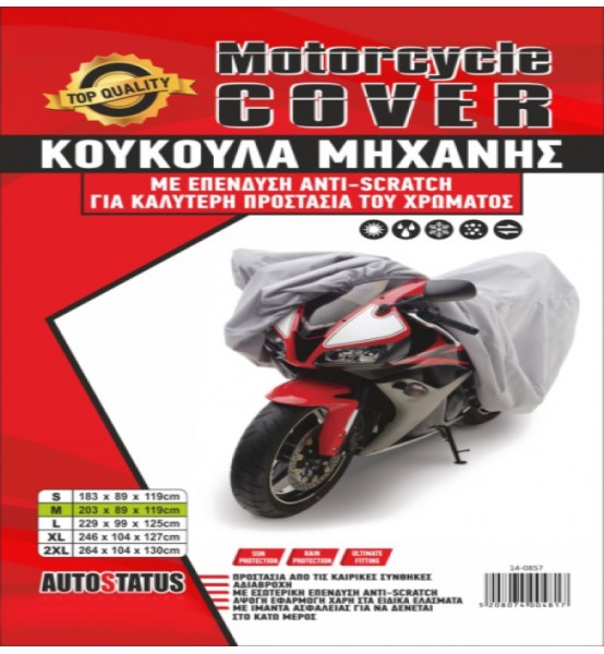 Κουκούλα για μότο ραμμένη και θερμοκολλημένη με επένδυση από βαμβάκι και με ιμάντα ασφαλείας για να δένεται. Προσφέρει προστασία της μοτοσυκλέτας από την βροχή τον ήλιο σκόνη και πάγο.