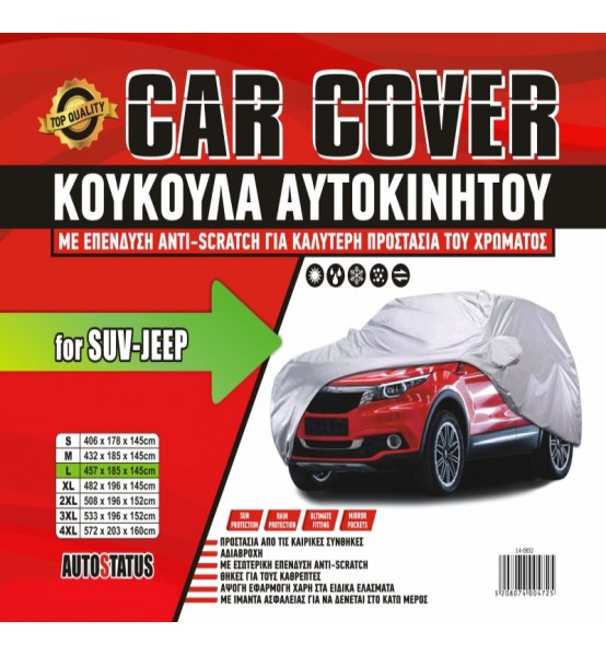 Kουκούλα αυτοκινήτου ραμμένη και θερμοκολλημένη με επένδυση από βαμβάκι έχει θήκες για τους καθρέπτες ειδικούς ιμάντες πρόσδεσης. Προσφέρει προστασία του αυτοκινήτου από την βροχή τον ήλιο σκόνη και πάγο. Κατάλληλη για Suv- Jeep.