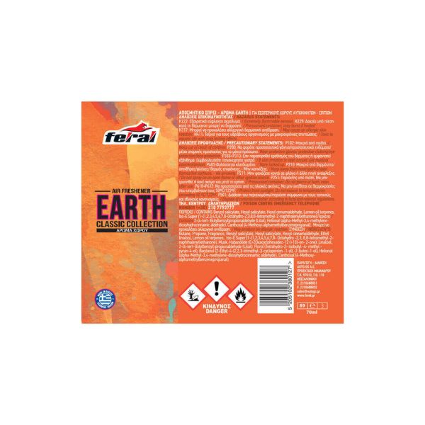Earth Τα αρωματικά χώρου Feral είναι προϊόντα μοναδικής σύνθεσης και διάρκειας. Αρωματίζουν τον χώρο και χαρίζουν ευχάριστη ατμόσφαιρα χάρη στα προσεγμένα αποστάγματα αρωμάτων με τα οποία παράγονται. H συλλογή αυξάνεται συνεχώς, διατηρώντας πάντοτε την ποιότητα και το εκλεπτυσμένο γούστο στην επιλογή του αρώματος.