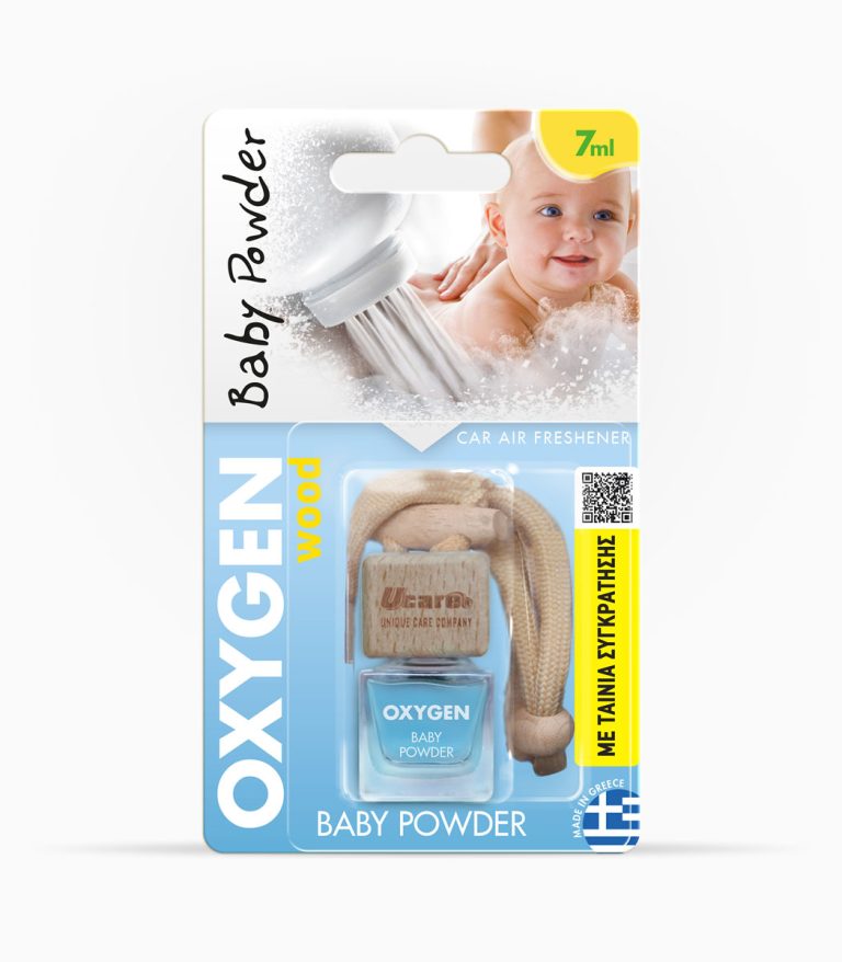 Κρεμαστό αρωματικό μπουκαλάκι για την καμπίνα του οχήματος. Αποτελείται από μια χάρτινη τυπωμένη πλάτη, ένα γυάλινο μπουκαλάκι με ξύλινο καπάκι, κορδόνι κρέμασης και ελαστική ταινία συγκράτησης, σε συσκευασία blister. Το μπουκαλάκι περιέχει 7 ml από αρωματικό ελαιώδες μείγμα που απελευθερώνει αργά τη μυρωδιά των συστατικών του ΠΟΥΔΡΑ / BABY POWDER OXYGEN wood αρωματικό αυτοκινήτου στον αέρα, μέσω του υφασμάτινου κορδονιού. ΟΔΗΓΙΕΣ ΧΡΗΣΗΣ