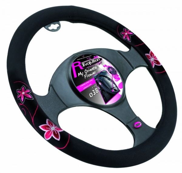 Το κάλυμμα τιμονιού MY ORIENTAL FLOWER είναι κατασκευασμένο από υψηλής ποιότητας υλικό. κατασκευασμένο για να ταιριάζει σε όλους τους τύπους τιμονιών αυτοκινήτου. Έχει διάμετρο 38 cm και διατίθεται σε μαύρο και ροζ.
