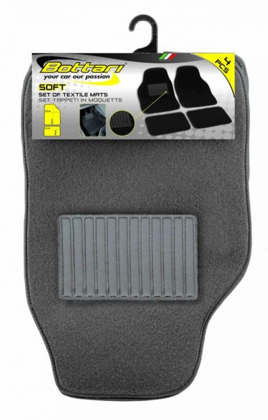 Σετ 4 πατάκια από μαλακά υφασμάτινα υλικά. Είναι κατασκευασμένο για να ταιριάζει σε όλους τους τύπους αυτοκινήτων και αποτελείται από 4 τεμάχια. δύο για τους μπροστινούς και δύο για τους πίσω επιβάτες. Διατίθεται σε γκρι χρώμα.