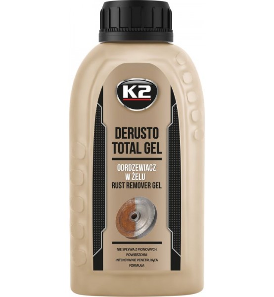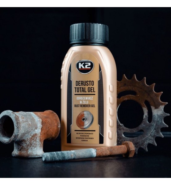 Το αντισκωριακό τζελ K2 Derusto Total Gel είναι ένα προϊόν για επαγγελματίες. Έχει την δυνατότητα να αφαιρεί τη σκουριά γρήγορα και αποτελεσματικά από όλους του τύπους μετάλλων. Εναλλακτικά αν αραιωθεί με νερό μπορείτε να το χρησιμοποιήσετε για αφαίρεση σκουριάς από πλακάκια και είδη υγιεινής.