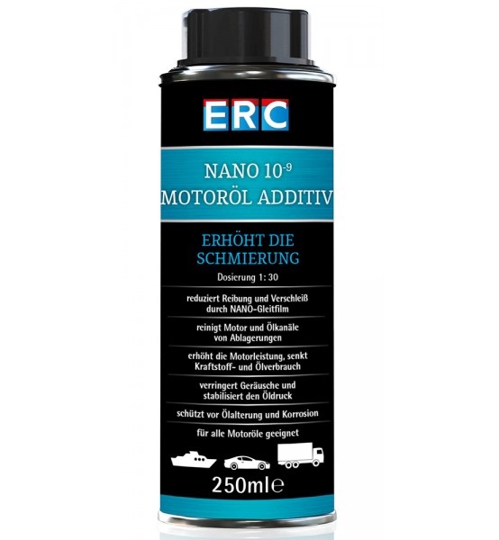 ERC NANO 10-9 Motoröl additiv Ένα ειδικό πρόσθετο, για την μοριακή εσωτερική επίστρωση του κινητήρα που βασίζεται στη νανοτεχνολογία για μείωση της τριβής και της φθοράς (χωρίς στερεά πρόσθετα). Το πρόσθετο ERC NANO 10-9 Motoröl μειώνει την τριβή και τη φθορά πολύ αποτελεσματικά. Καθαρίζει εναποθέσεις από τον κινητήρα και τις διόδους λαδιού. Αυξάνει την απόδοση του κινητήρα και μειώνει την κατανάλωση. Μειώνει τον θόρυβο και σταθεροποιεί την πίεση λαδιού. Προστατεύει από τη γήρανση του λαδιού και τη διάβρωση του κινητήρα. Διευκολύνει τις κρύες εκκινήσεις και αυξάνει τις ιδιότητες λειτουργίας έκτακτης ανάγκης.