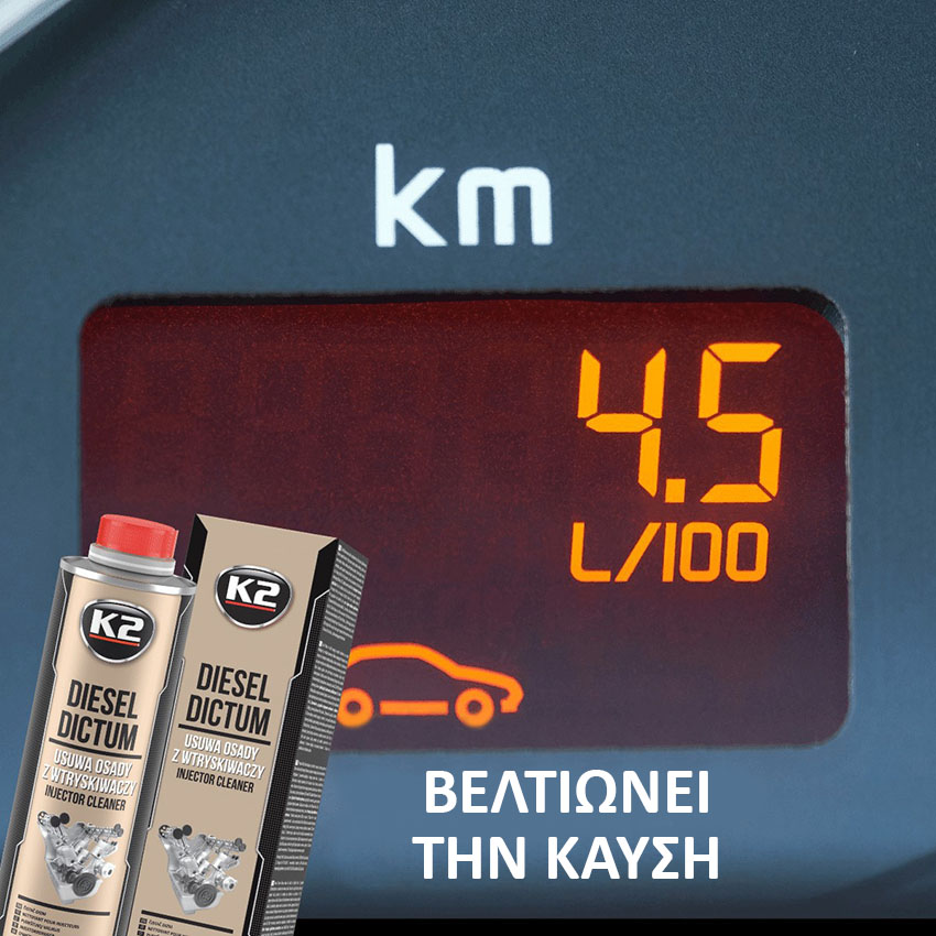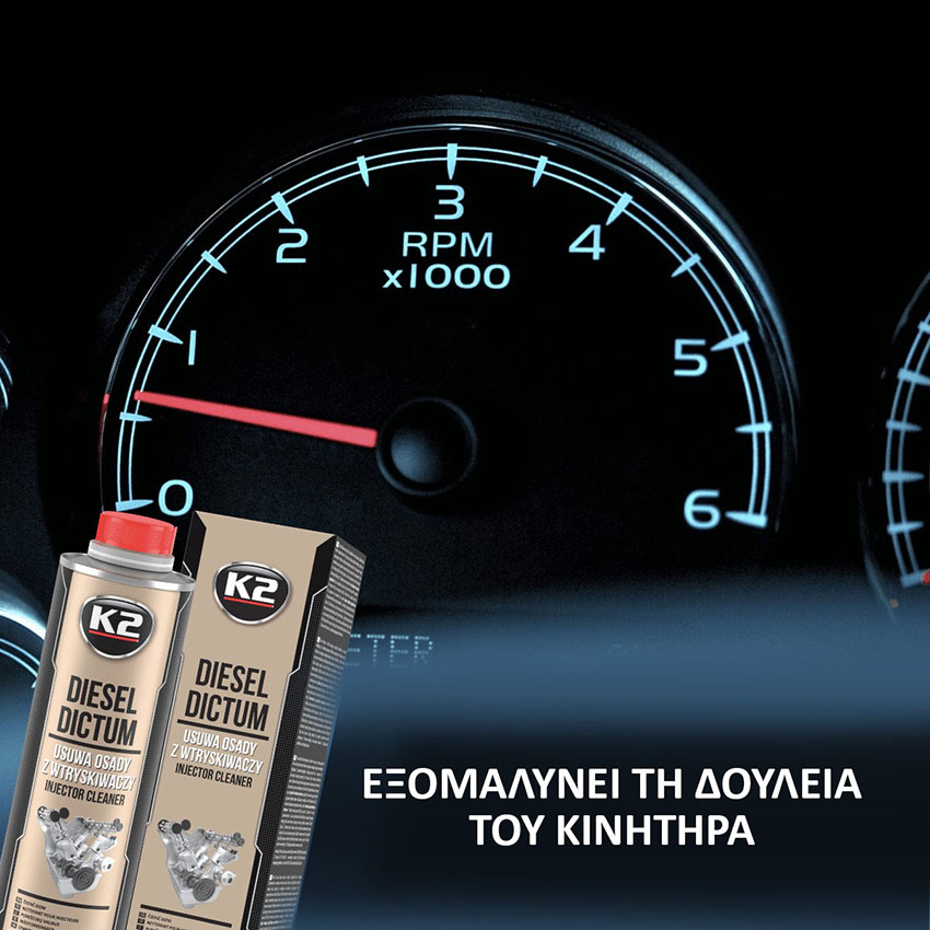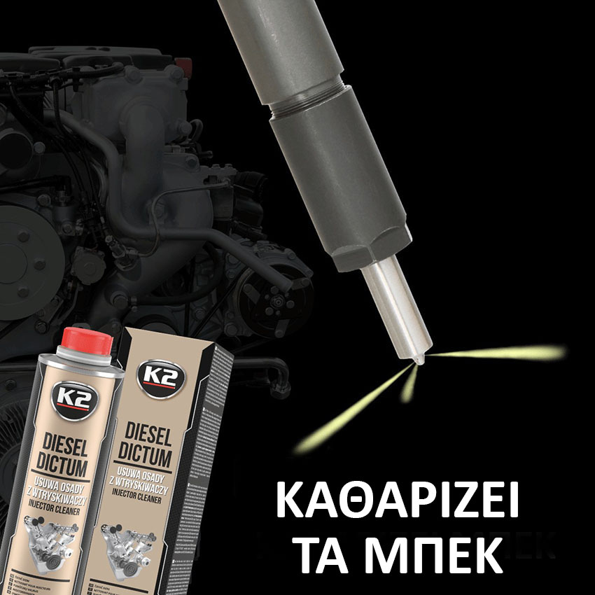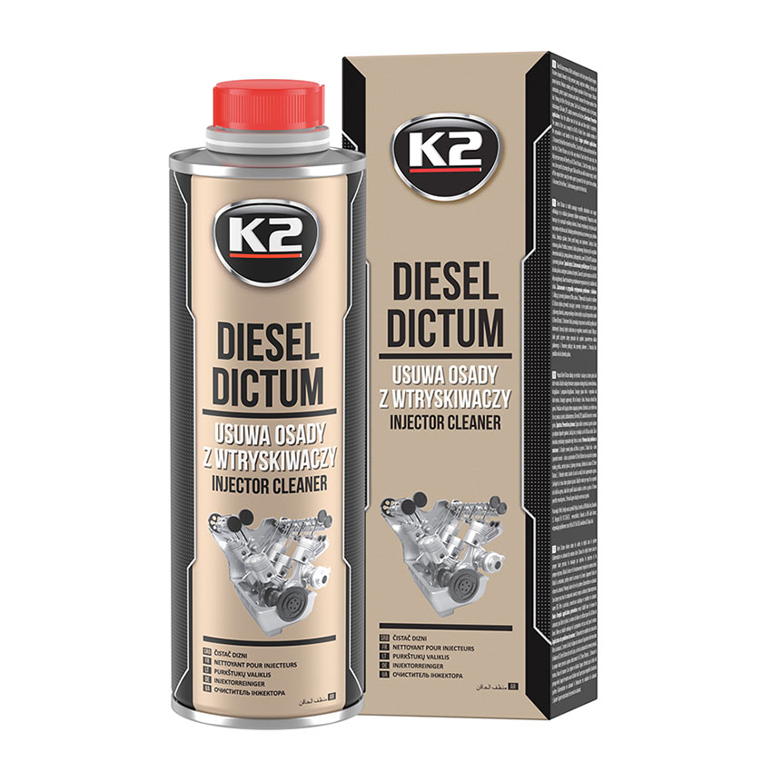 Ενισχυτικό – καθαριστικό πετρελαίου K2 Diesel Dictum για τον καθαρισμό του συστήματος τροφοδοσίας καυσίμου ενός πετρελαιοκινητήρα και των εξαρτημάτων υψηλής ακρίβειας όπως μπεκ και αντλία ψεκασμού υψηλής πίεσης, από ενοχλητικές επικαθίσεις. Εξασφαλίζει την τέλεια λειτουργία τους και λόγω των εξαιρετικών λιπαντικών ιδιοτήτων του, επεκτείνει τη διάρκεια ζωής ολόκληρου του συστήματος τροφοδοσίας καυσίμου. Κατάλληλο για κινητήρες τεχνολογίας common-rail και ψεκασμού υψηλής πίεσης με αντλία-μπεκ.